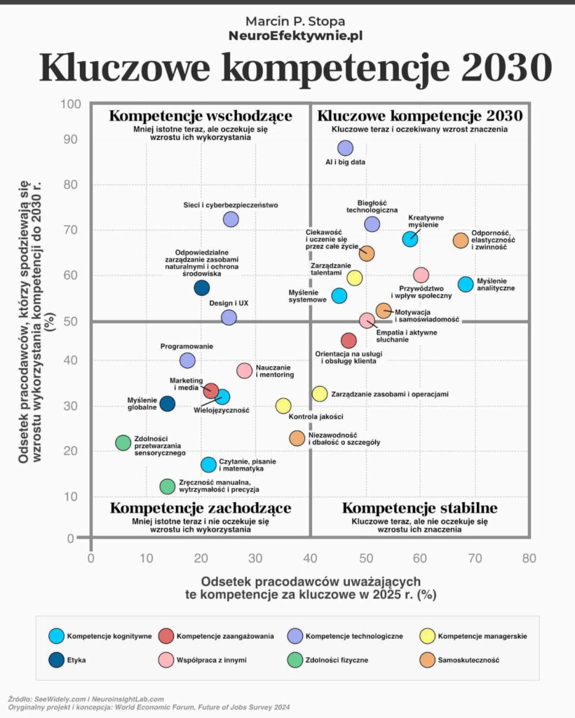 🎯 Umiejętności z inteligencji emocjonalnej (motywacja, samoświadomość, empatia) zajmują miejsca w TOP 10 z 26 kluczowych kompetencji przyszłości