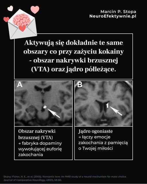 Twój mózg dosłownie „ćpa” miłość. Aktywują się dokładnie te same obszary co przy zażyciu kokainy – obszar nakrywki brzusznej (VTA) oraz jądro półleżące.