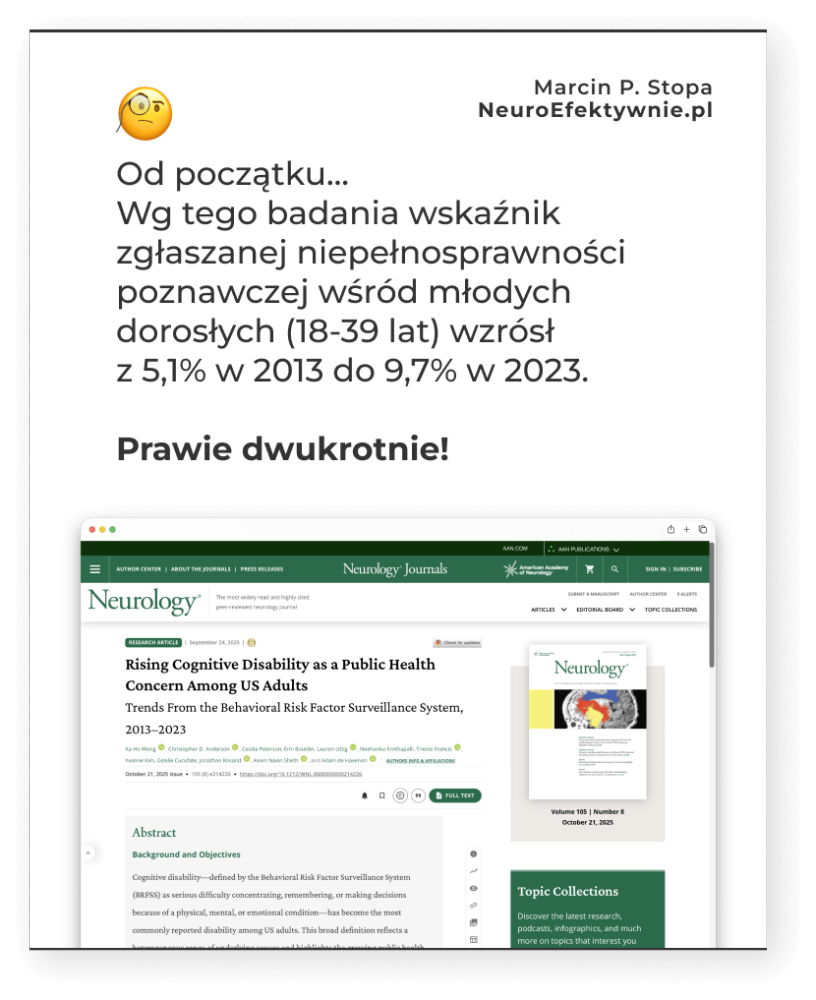 Wg tego badania wskaźnik zgłaszanej niepełnosprawności poznawczej wśród młodych dorosłych (18-39 lat) wzrósł z 5,1% w 2013 do 9,7% w 2023.